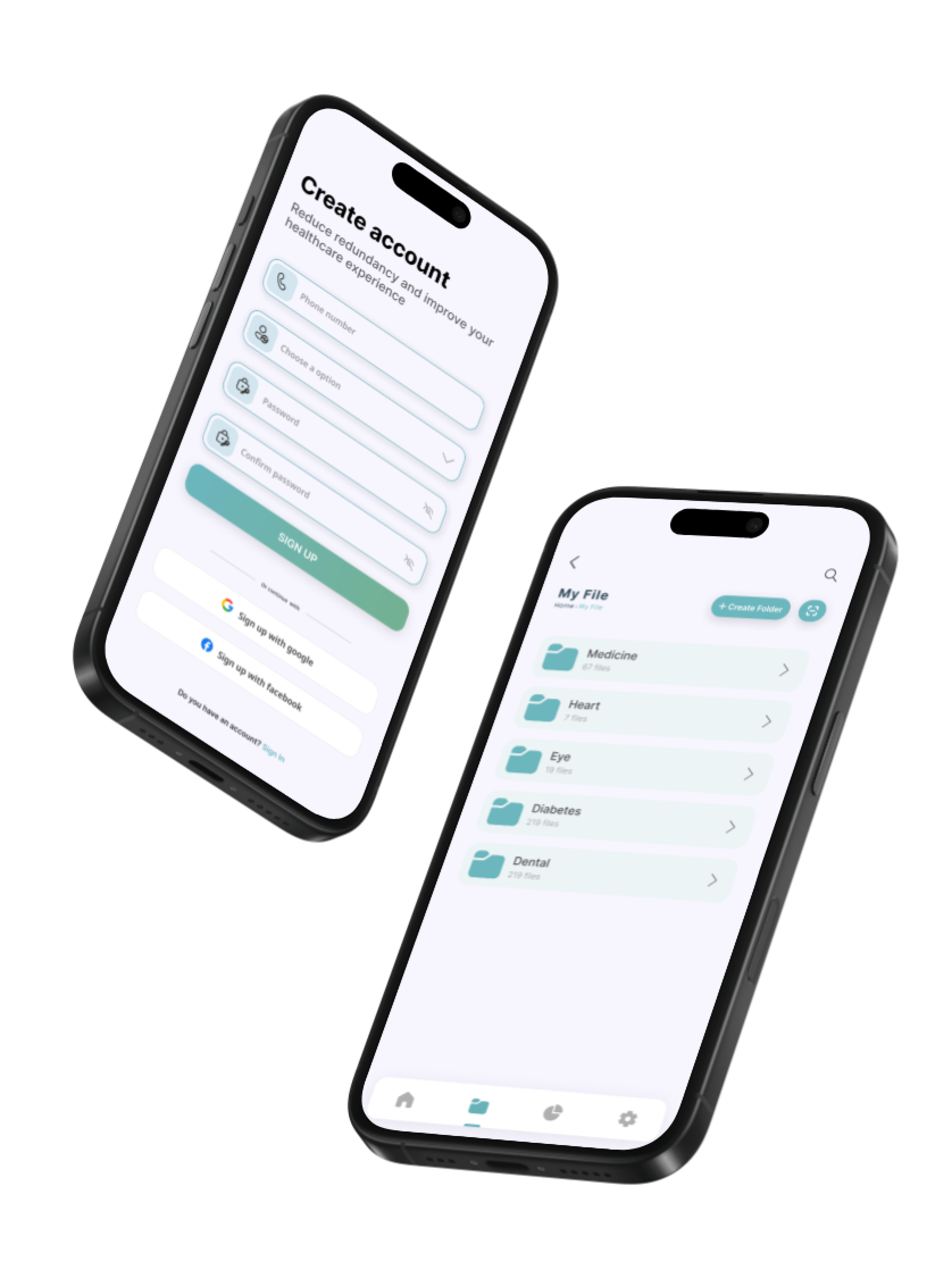 HealHub brings all specialists into one app with a clean mint‑teal UI. Patients create an account in under a minute, then organize records in clear folders (Medicine, Heart, Eye, Diabetes, Dental). A home dashboard surfaces today’s health status with tiles for blood pressure and diabetes, plus quick access to Activities, My File, and My Reports. We designed the system in Figma using atomic components and iOS HIG patterns for familiar navigation. Form fields support phone-based OTP sign‑in and social auth, reducing friction. File management uses consistent card patterns and search, so lab results and prescriptions are easy to find. Metrics cards use high-contrast badges and simple trend cues to help non‑technical users understand changes at a glance.
